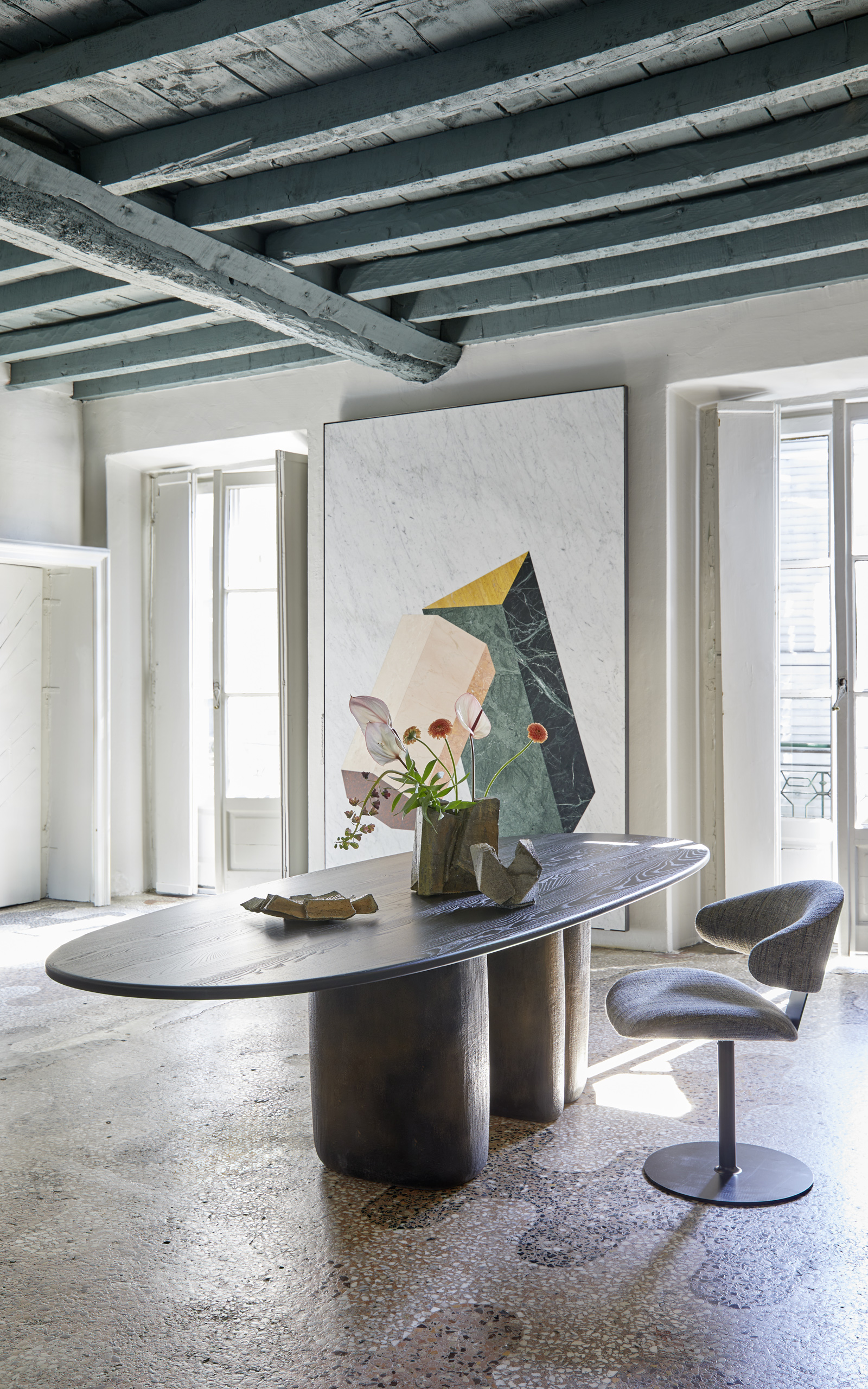 Perfektion ist das beste Rezept, um echte Schönheit zu verhindern. Denn die kommt aus dem Zufall, dem Wandel, dem Alter und der Individualität. Daran erinnert uns seit rund 500 Jahren immer wieder die japanische Wabi-Sabi-Philosophie. Mit JAKU haben wir die Idee einer organischen Ästhetik in einen skulpturalen Tisch übersetzt. Er fußt auf markanten Keramiken, die mit extra hohem Schamottanteil nach traditionellem Handwerk als Unikate gefertigt werden.