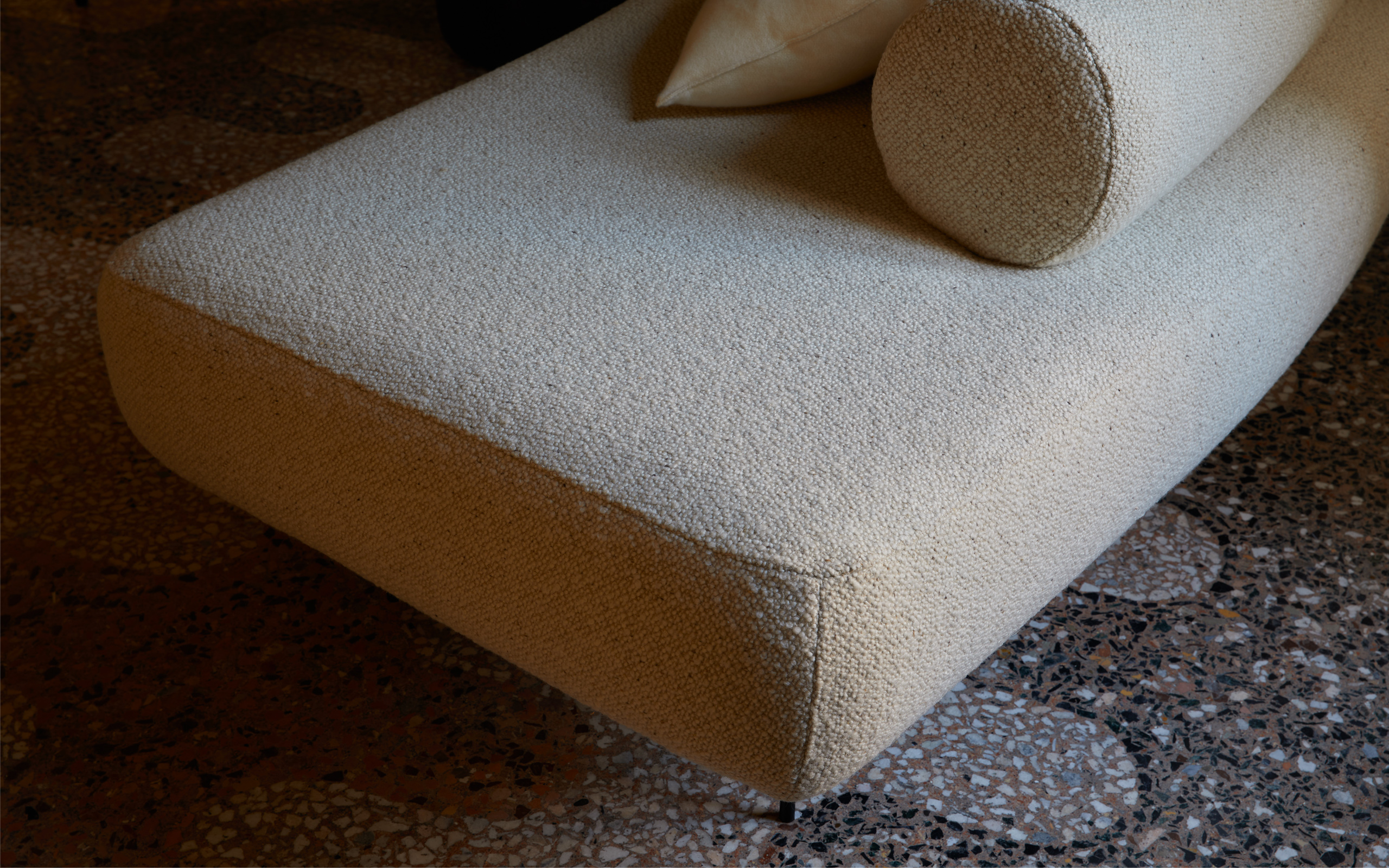 The continuous backrest is slightly recessed and does not align flush with the seat. This creates an intriguing geometry from every perspective, allowing the piece to be freely positioned within a space.